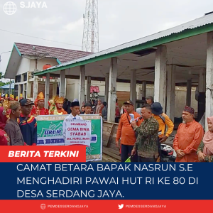 BETARA. Perdana di Desa Serdang Jaya, Tahun ini Desa Serdang Jaya membuat gebrakan kegiatan pawai untuk pertama kalinya,Pelepasan pawai HUT RI oleh Camat Betara Bapak Nasrun S.E meskipun cuaca pagi gerimis tidak menurunkan minat peserta pawai yang di ikuti lembaga dan juga kelompok unsur masyarakat yang ada di Desa Serdang Jaya dan juga ada juga yang hadir dari Desa tetangga . Panitia Pawai ini juga menyediakan banyak dorprize menarik. Dan semoga tahun depan acara pawai HUT RI ini bisa di ikuti lebih banyak peserta.SENIN/18/8/2025